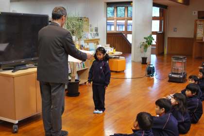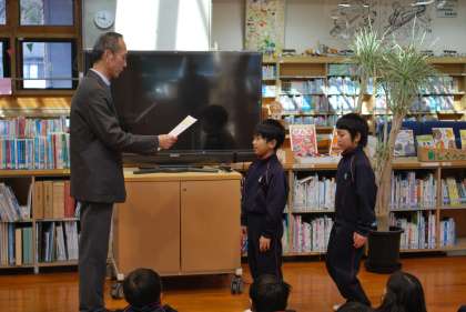 校長先生からは「冬休みの間、病気やケガに気を付けて元気に過ごし、1月9日は21名全員の元気な姿が見たいです」というお話をいただきました。その後、マラソン大会や絵画・習字・作文の応募作品コンクールの表彰を行いました。