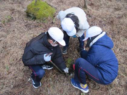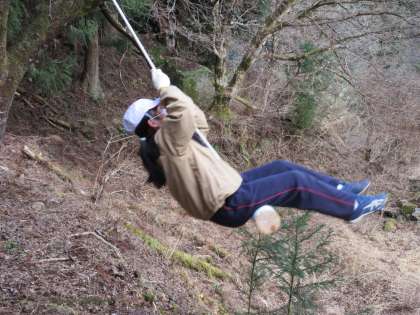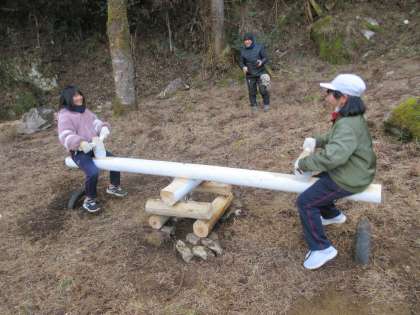 3・4年生の総合的な学習の時間に地域に貢献したい!と子どもたちから話が出たので、公園がないから公園のような場所は作れないかな?と考えたところ、地域の方の協力のもとシーソーとターザンブランコが完成しました!