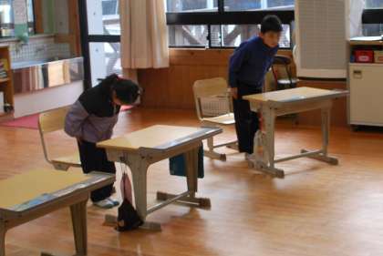1限の授業開始前に「礼」の練習をしていました。担任の先生の説明をよく聞いて一生懸命に取り組んでいました。