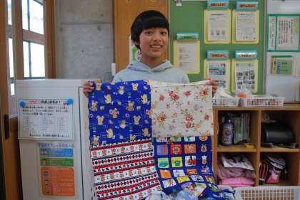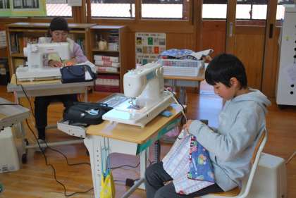 5限の授業で、6年生は端切れの布をミシンで縫い合わせ、卒業記念品のプロジェクターカバーを製作していました。