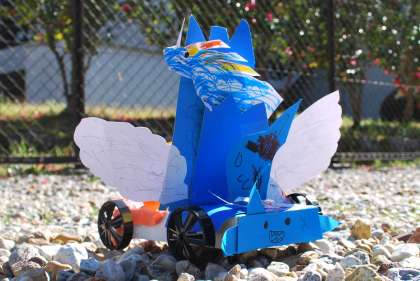 ◎車の上を飛んでいる龍を、頑張って作りました。(写真中:子どもの感想)
