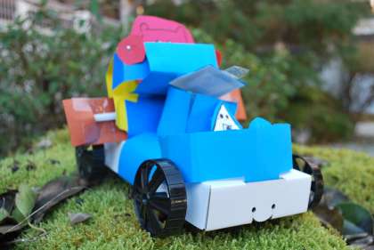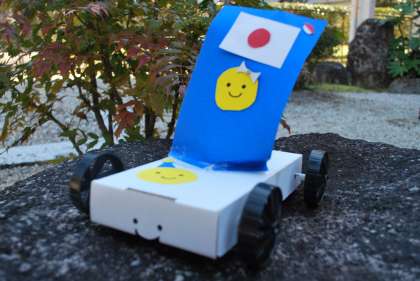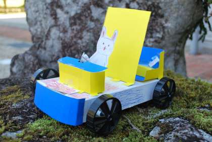 ◎ハンドルを頑張って作りました。運転席などがしっかり作れました。(写真中:子どもの感想)