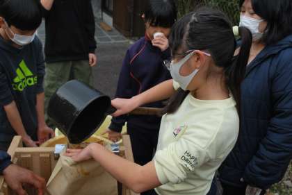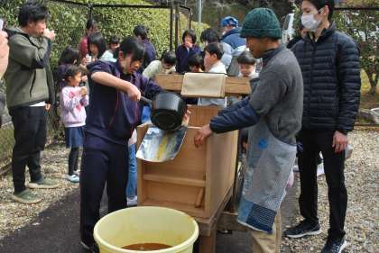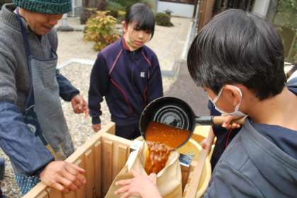 醤油を搾り取るための袋に麹や塩水をまぜたもろ味を入れ、醤油を絞る装置で圧をかけます。