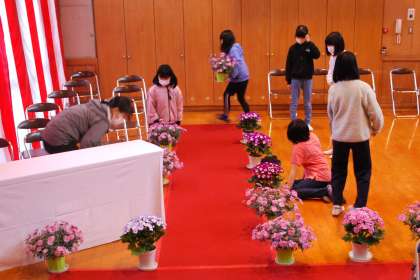 5.6年生に進級する児童8名と入学式の会場設営、1年生教室の飾りつけなどをしました。少し時間に余裕があったので、明日行う入学式のリハーサルをしました。