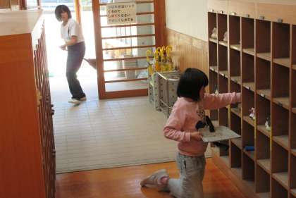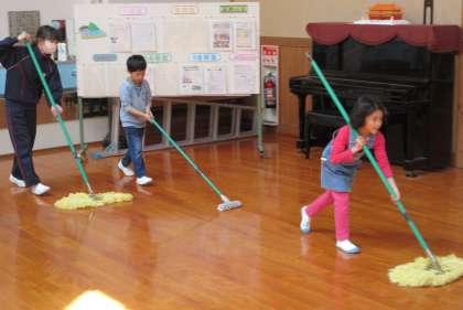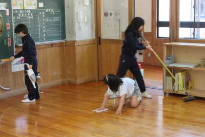学年が違う子たちが力を合わせて学校をきれいにしています。1年生も上級生の子たちに清掃の仕方を教えてもらい、一生懸命に校舎内を掃除していました。