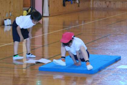 かいきゃく前転やかいきゃく後転の他に、かべとう立や側方とう立回転など、4つの学年が合同で行うと、いろいろな技の練習を見ることができます。