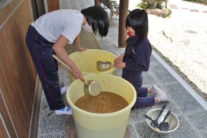4月に仕込んだ醤油の天地返しの作業を5,6年生が当番を決めて定期的に行います。天地返しは、仕込んだ麹の上下を入れ替える作業です。麹は塩分を多く含むため、時間がたつと塩が下に溜まってしまいます。底に溜まった塩を表面側にもってくることが肝心なようです。天地返しの作業中、子どもと一緒に麹の味見をしました。とても塩辛かったです。