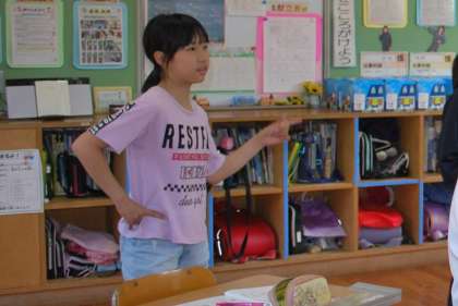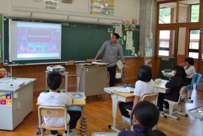 体を動かしながら英語で発音することにより、声の上がり下がりによって起こる音の変化やリズムを感じ取っていました。1年間を通して少しずつ英語での表現を身に付けていきます。