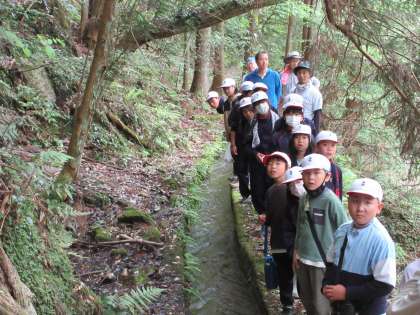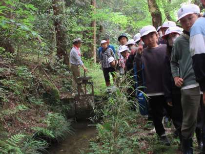 来週から始まる米作りに向けて、田んぼの水はどこから引いているか調査にいきました。地域の方の案内のもと、田んぼ水路をさかのぼり、足助川のどこから水を引いているのか実際に見て知ることができました。