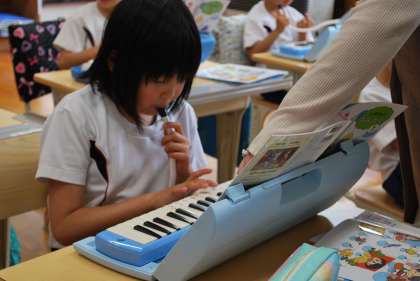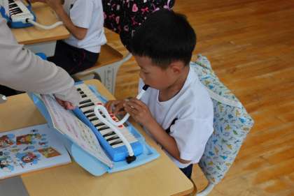 鍵盤ハーモニカで「ひのまる」の曲を練習した後、一人ずつ演奏をして練習の成果を披露していました。