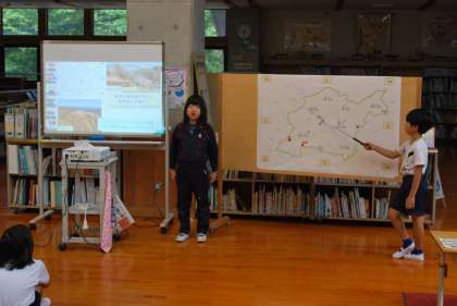 校長先生のお話の後、3・4年生が豊田市の様子について発表しました。練習の時以上に聞き取りやすい声の大きさで発表し、授業で学習した内容がとても分かりやすく聞くことができました。