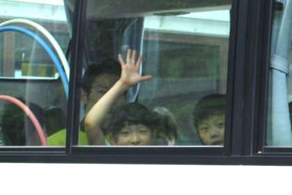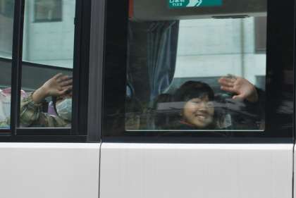 バスに乗って足助プールに向かう子どもたちの表情です。水泳や水遊びの学習を心待ちにしていた様子がうかがえます。