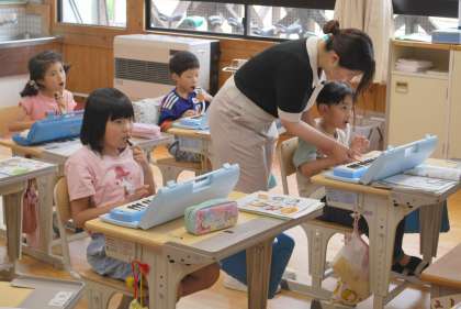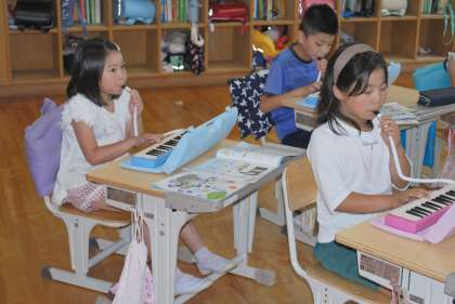 鍵盤ハーモニカでドレミの音を一音ずつ出しながら、ドレミのうたを歌いました。
