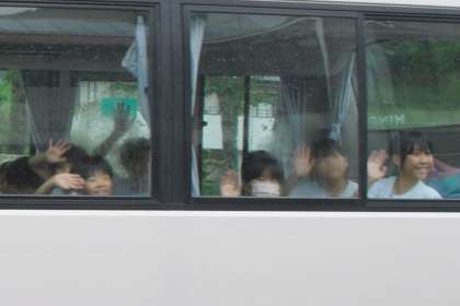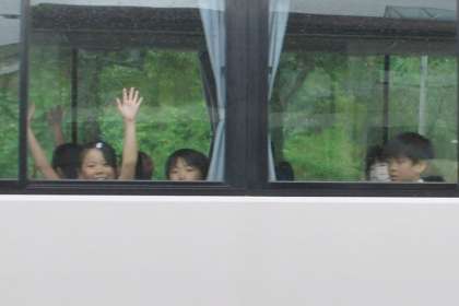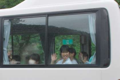 今年度最後の水遊びや水泳の学習を行うために、子どもたちはバスに乗って足助プールに行きました。お見送りする公務手さんたちに手を振る様子を見ても、とても楽しみにしていた様子がうかがえます。