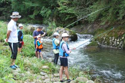 休憩をした後、再び思い思いの川遊びが始まりました。釣竿を持って魚釣りもしました。地域コーディネーターの方たちも子どもたちが安心して川遊びを楽しめるように見守っていただきました。ありがとうございます。