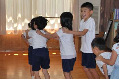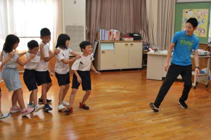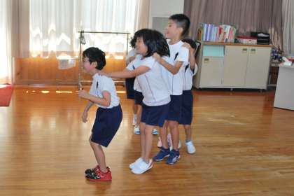 両足をそろえて、前・後・前・前・前とリズムよくジャンプする「ジェンカ」です。一人一人がリズムに合わせて動いているだけで楽しそうでした。