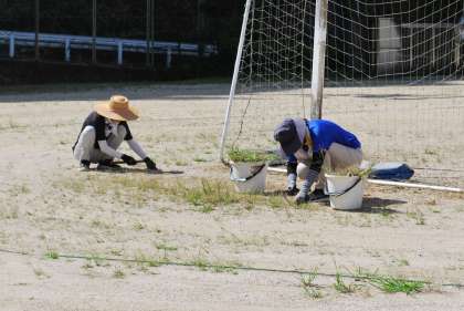 校内整備員さんが定期的に運動場の整備をする時に草を刈ってくれますが、草は伸びるのが早く、なかなかきれいになりません。