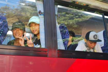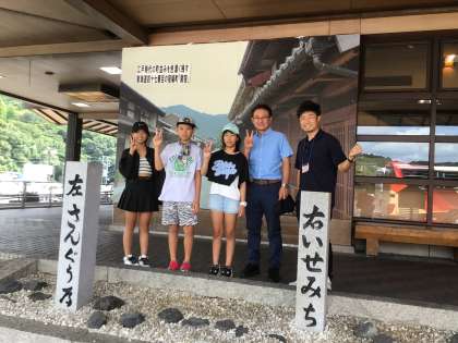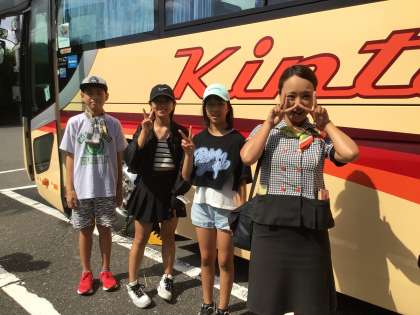 途中休憩でとてもユニークなバスガイドさんと記念撮影