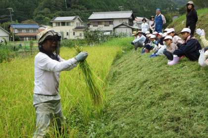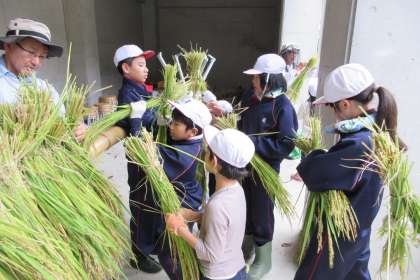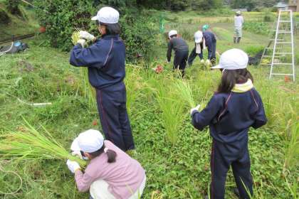 共働本部の方に稲の刈り方を教えていただいた後、全校児童で稲刈りをしました。最初はぎこちない手つきの子もいましたが、慣れてくると手早く刈り取れるようになり、稲を次々と刈り取っていました。