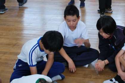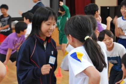 5,6年生はバスに乗って明和小学校へ行きました。他校の児童とペアになってゲームをした後、英語で好きな食べ物を聞いたり答えたりする等して交流を深めていました。