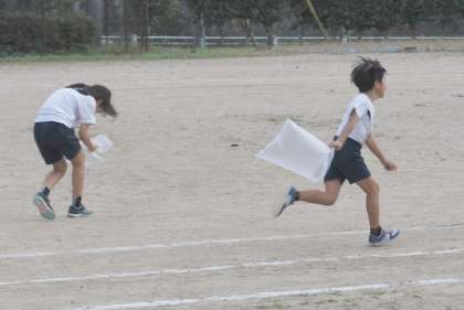 一人一人にビニール袋を配付した後、袋に空気を集めて上へ上へとたたき上げだり、運動場を走り回って空気を袋に集めたりして様々な遊びを楽しんでいました。