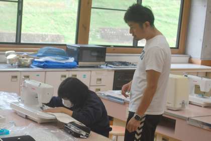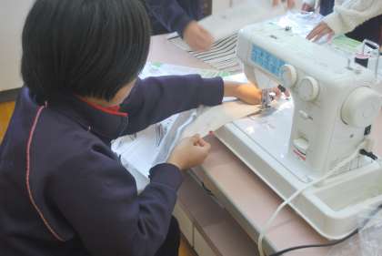 好きな絵柄の布を選び、製作しています。作業が早く済んだ子が「ここは、こうするんだよ」等と教える場面があり、楽しく活動していました。