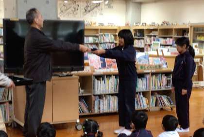 校長先生のお話の後、豊田市小中学生科学研究作品展の表彰伝達と赤い羽根募金の連絡が行われました。