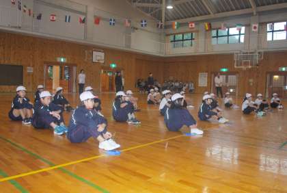 開会式では、校長先生のお話を子どもたちは、いい姿勢で聞いていました。6年生による力強い選手宣誓と準備体操(ラジオ体操)を行い、競技が始まりました。