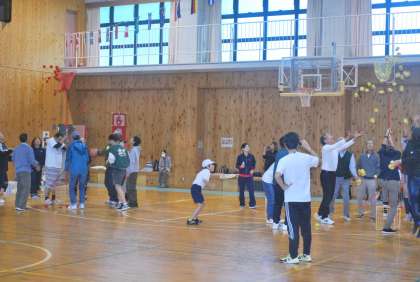 共働本部種目の玉入れです。保護者を含む地域の方や来賓の方たちも一緒に玉入れをしました。ご参加いただき、ありがとうございました。