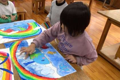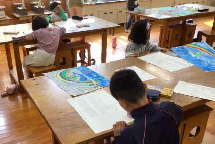 色を指で広げてぼかす技法を使って描きました。仕上げをして完成した子から感想用紙に読んだ本の感想や作画に苦労したこと等を書きました。