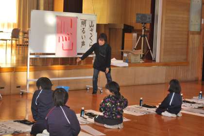 3年生は「山ざくら」、4年生は「明るい声」、5年生は「四季の風」、6年生は「満天の星」という文字をそれぞれ書きます。子どもたちは自分の手本の文字を確認しながら、丁寧に書いていました。