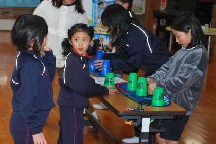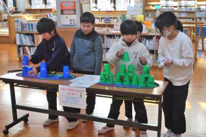 休み時間になると、スポーツスタッキングに興じる子たちが集まります。「萩野小から世界へ」と夢は広がります。