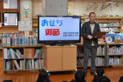 校長先生はパワーポイントを活用し、お正月のおせち料理について話されました。校長先生のお話に子どもたちは興味深く話を聞いていました。