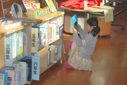 子どもたちは、荷物を梱包する時に使う緩衝材とモールで作った「すきまちゃん」を、いろいろな場所に置いて学習用タブレットで写真撮影をしました。「すきまちゃん」と楽しく隙間を見つけて楽しんでいました。