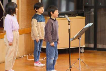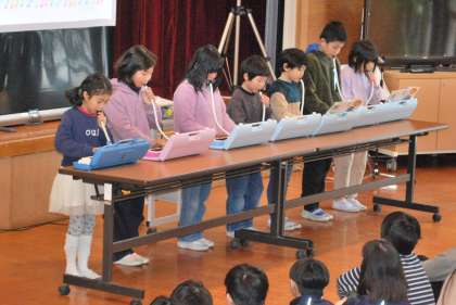 2限は多目的ホールで学習発表会を行いました。1,2年生は生活の学習でいろいろな生き物について調べたことをクイズ形式にまとめて発表しました。発表の最後に鍵盤ハーモニカの合奏を披露しました。