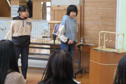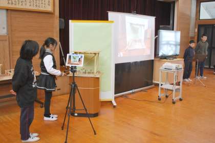 3〜6年生は川面町の「こどもの森」に設置してほしい遊具や東屋のプレゼンテーションをしました。子どもたちは遊具や東屋の模型をプロジェクターを使って映しながら、聞き取りやすい声で発表していました。