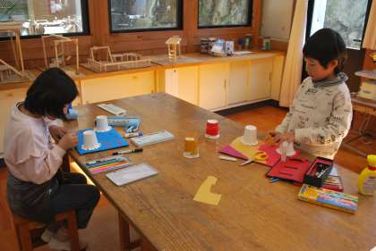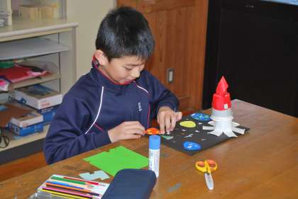 紙コップと輪ゴムで飛び出す仕組みを作り、何を飛び出させるかを考えました。生き物が水中から飛び出す時の波紋を台紙に描いたり、宇宙の様子をいろいろな色紙で表現したりと、子どもたちの発想が豊かで楽しいものばかりでした。