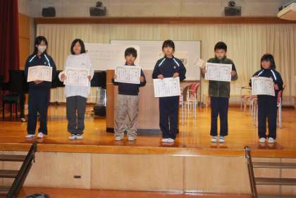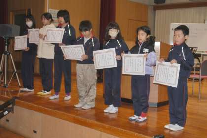 校長先生のお話の後は、書き初め大会、読書感想画コンクール等の表彰伝達を行いました。