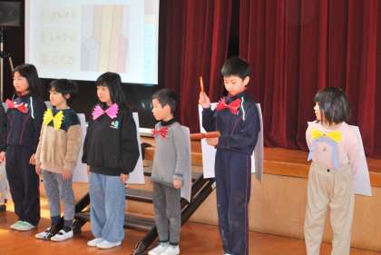 3,4限に6年生を送る会を行いました。1,2年生の出し物は『学校クイズ』でした。「この鼻は、どの先生でしょうか?」等、楽しいクイズが出題されました。