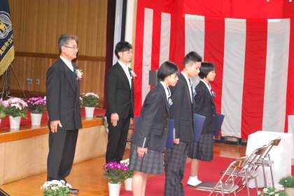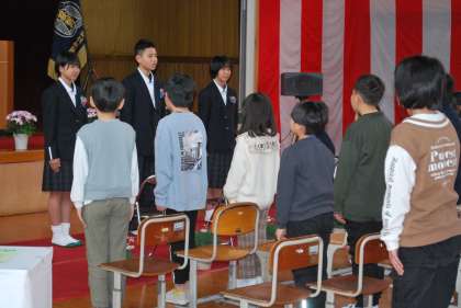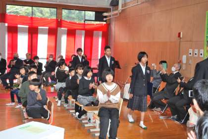 別れの言葉、校歌斉唱の後、卒業生3人が退場します。在校生が拍手でお見送りです。