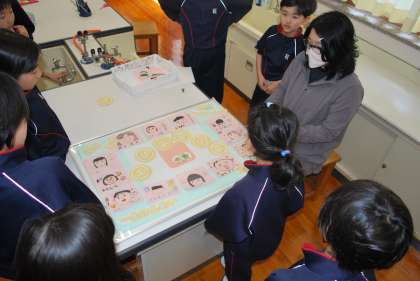 担任の先生と一緒に級訓のデザインを考えていました。とても和やかな雰囲気で作業が進んでいました。