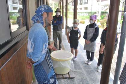 予定した作業をすべて終えた後、5,6年生が講師の方から今後の作業についての説明を聞きました。おいしい醤油を作るために真剣に聞いていました。