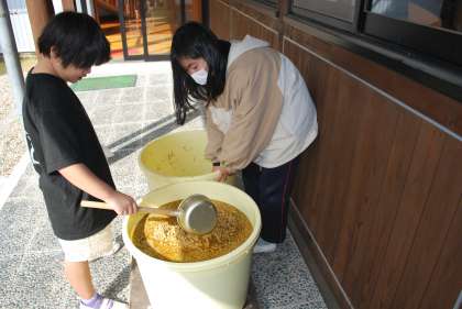 5,6年生が天地返しをしました。仕込みをした後、しばらくの間は塩が樽の下部に溜まらないように、こまめに天地返しをしなければいけません。手間のかかる作業ですが、5,6年生の子たちは手際よく作業をしていました。