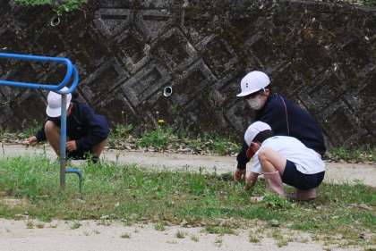 清掃の時間に全校児童と一緒に草取り作業をしました。曇りの天気だったので、作業をするには絶好の機会でした。