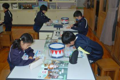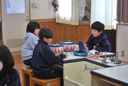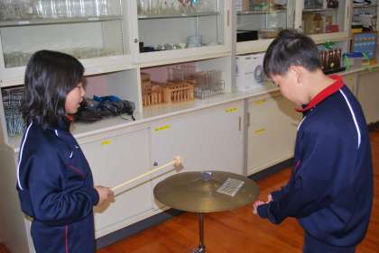 シンバルや太鼓を使って音を出し、その時の様子を観察しました。音を出すと楽器が震えていることに気付き、音と震えの関係について学習しました。