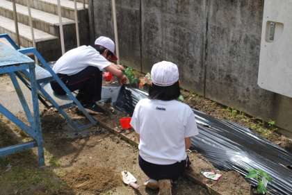 トマト、ナス、ピーマン、トウモロコシ、ズッキーニの苗を植えました。いつ、誰が水やりをするのか、当番を決めて育てていきます。