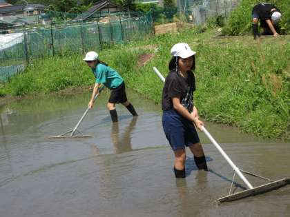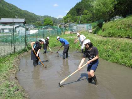 地域コーディネーターの方からご指導をいただきながら、5・6年生の児童で代掻きを行いました。田んぼの凹凸を無くすように鍬で土を動かし、とんぼで地面をならしました。今年もおいしいお米ができるように頑張っています。