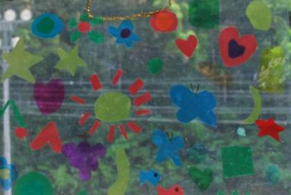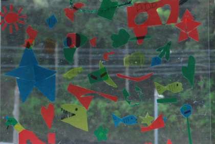 光を通す材料を使って好きな形をはさみで切り出し、いろいろな見え方や感じ方を楽しんでいました。教室の窓に飾り付けをしているとき、「きれいだね」とお互いの作品のよさを味わっていました。すてきな作品に仕上がりました。