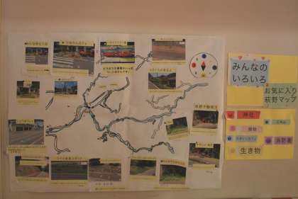 授業で学校の周辺を地図に表しました。東西南北を書いて、それぞれの方角に位置するところにある建物やお気に入りの場所等の写真を貼りました。