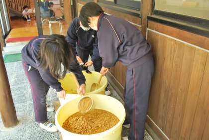 子どもたちは別の樽を用意し、協力して柄杓を使って移し替えていました。作業をしている子にどのくらいのペースで作業をしているのか質問をしたら、「今は週1回、天地返しをしている」とのことでした。こうした手間をかけることで、おいしい醤油ができるんですね。